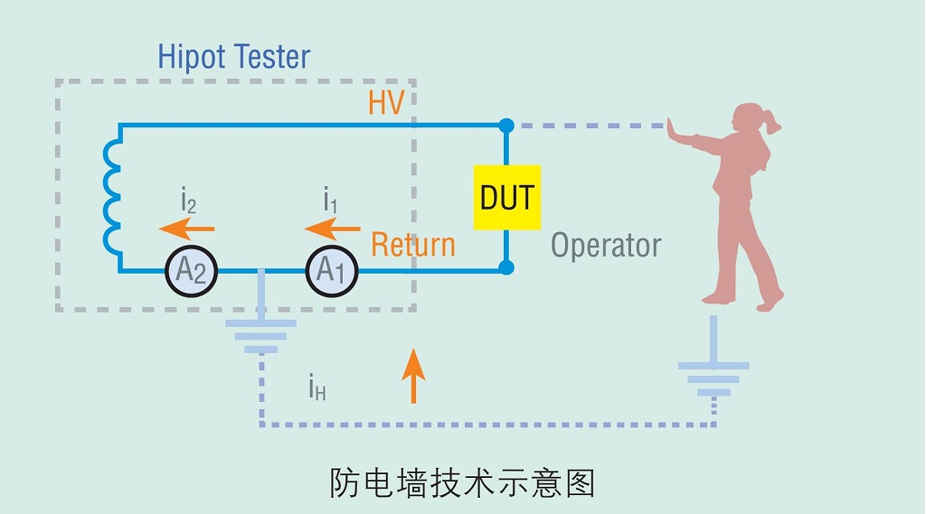 常州致新ZX9310/ZX9320系列耐壓機具有GFI防電墻功能來保護測試人員(原理如圖所示)。在突發(fā)人體感電的情形下,GFI能立即切斷儀器的電壓輸出,保護操作員不受電氣傷害。GFI功能偵測從地端(Earth GND)流回的電流iH與低端電流iL,比較后若大于0.5mA,則會立即切斷高壓輸出。