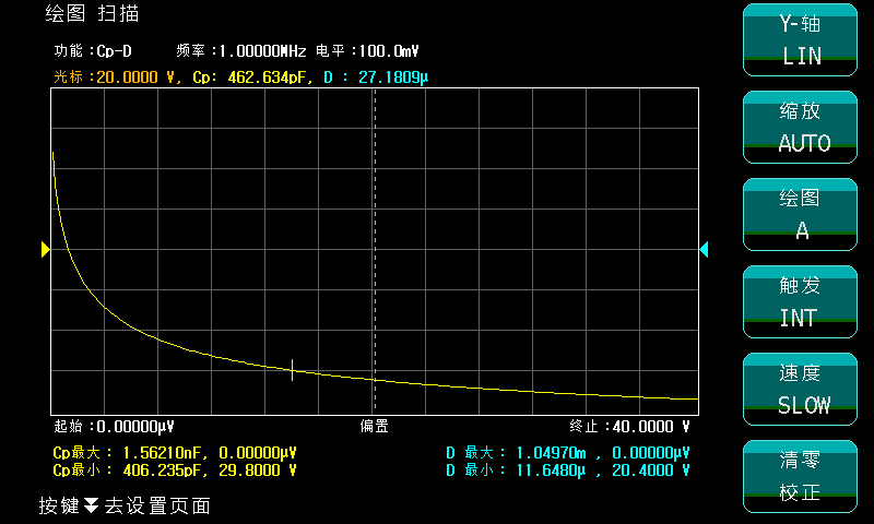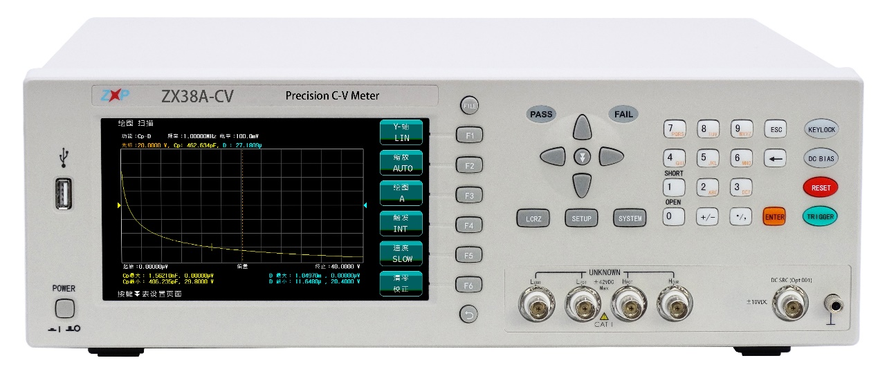 主要用于測試半導(dǎo)體器件PN結(jié)的勢壘電容在不同偏壓(V)下的電容量(C)。ZX38A-CV半導(dǎo)體C-V特性測試儀除了可以連接電腦上位機(jī)軟件掃描分析功能外,還提供在儀器大屏液晶顯示器上直接顯示C-V掃描曲線分析功能。這樣客戶不再需要為每臺儀器配置一臺電腦。這種方式既保證了測試效率,又降低了測試成本、還方便客戶在生產(chǎn)線上使用。還可以把儀器屏幕上顯示圖形和測試數(shù)據(jù)直接拷貝到U盤。
